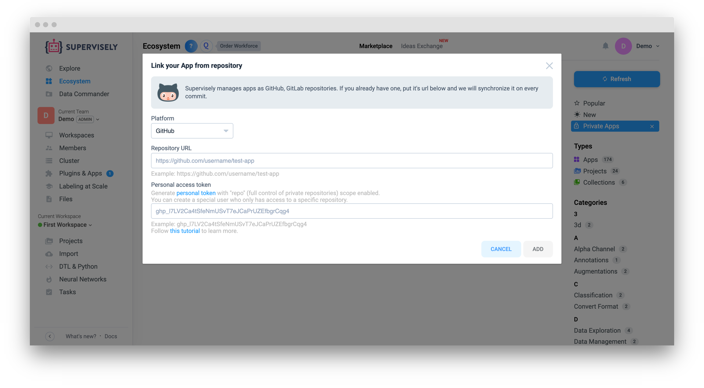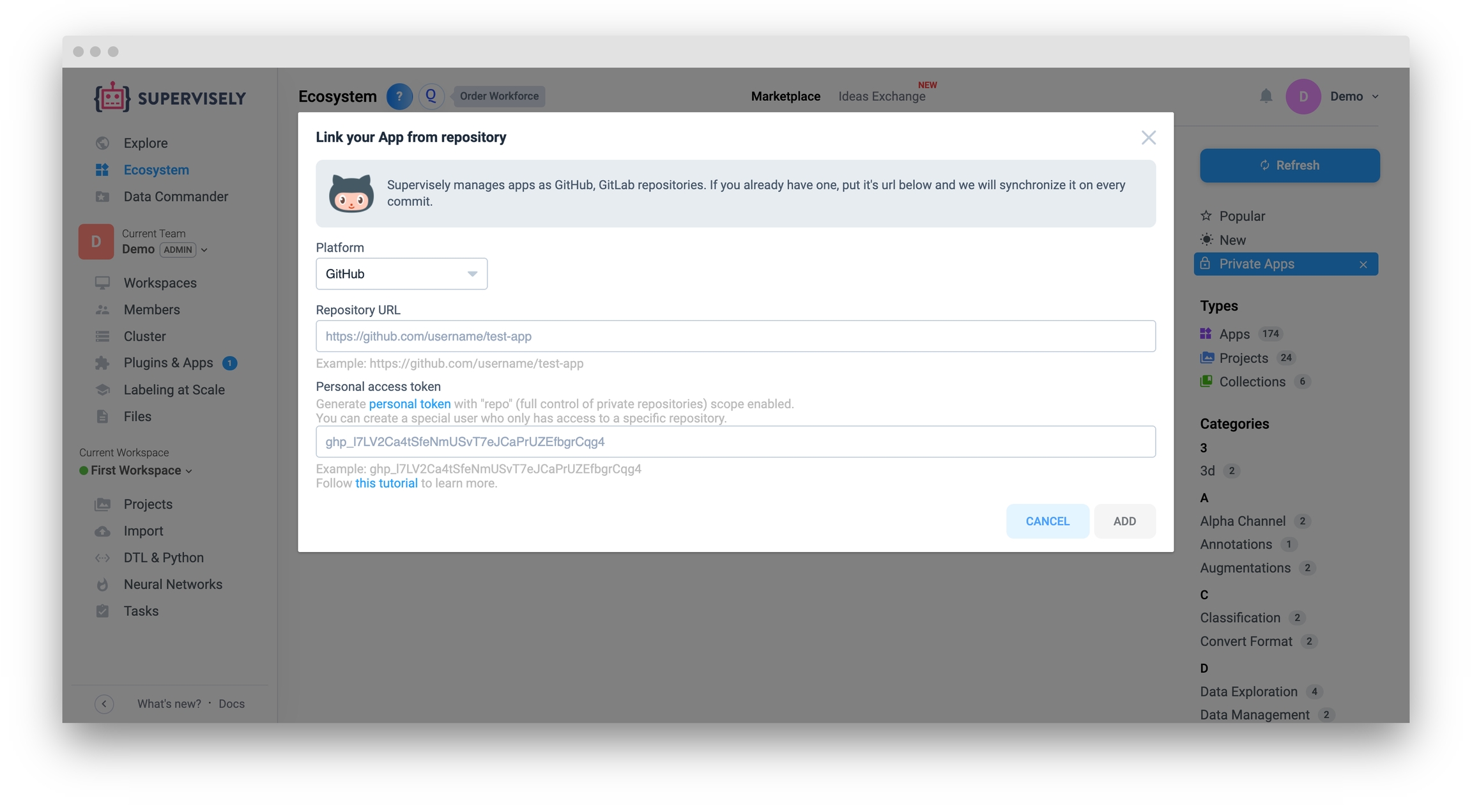 Since Supervisely app is just a git repository, we support public and private repos from the most popular hosting platforms in the world - GitHub and GitLab. You just need to generate and provide the access token to your repo.
