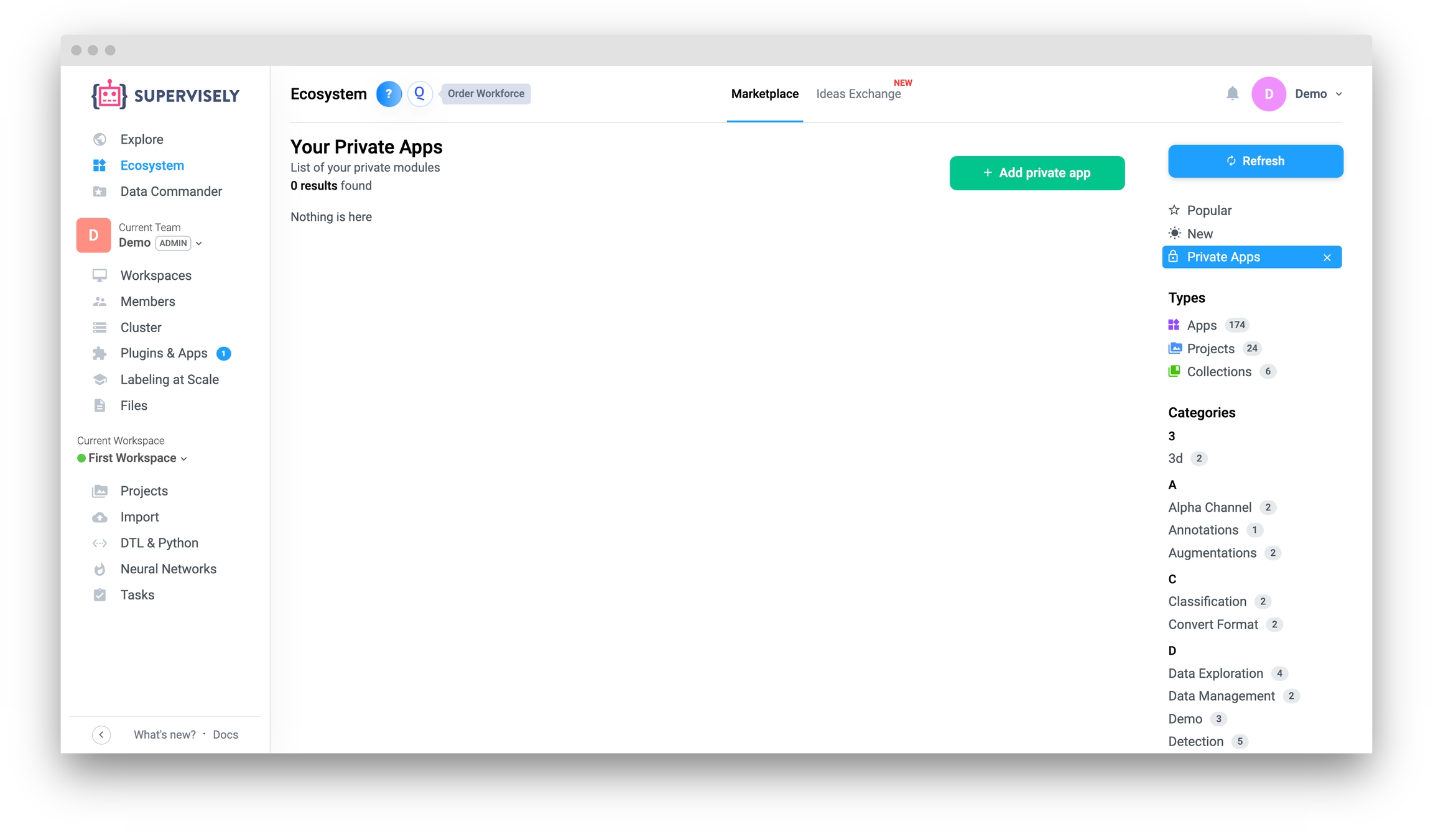 Now, open the Ecosystem page in the left menu and choose "Private Apps" in the right menu. You should see here your new application after a minute. Add it to your team and try it out!