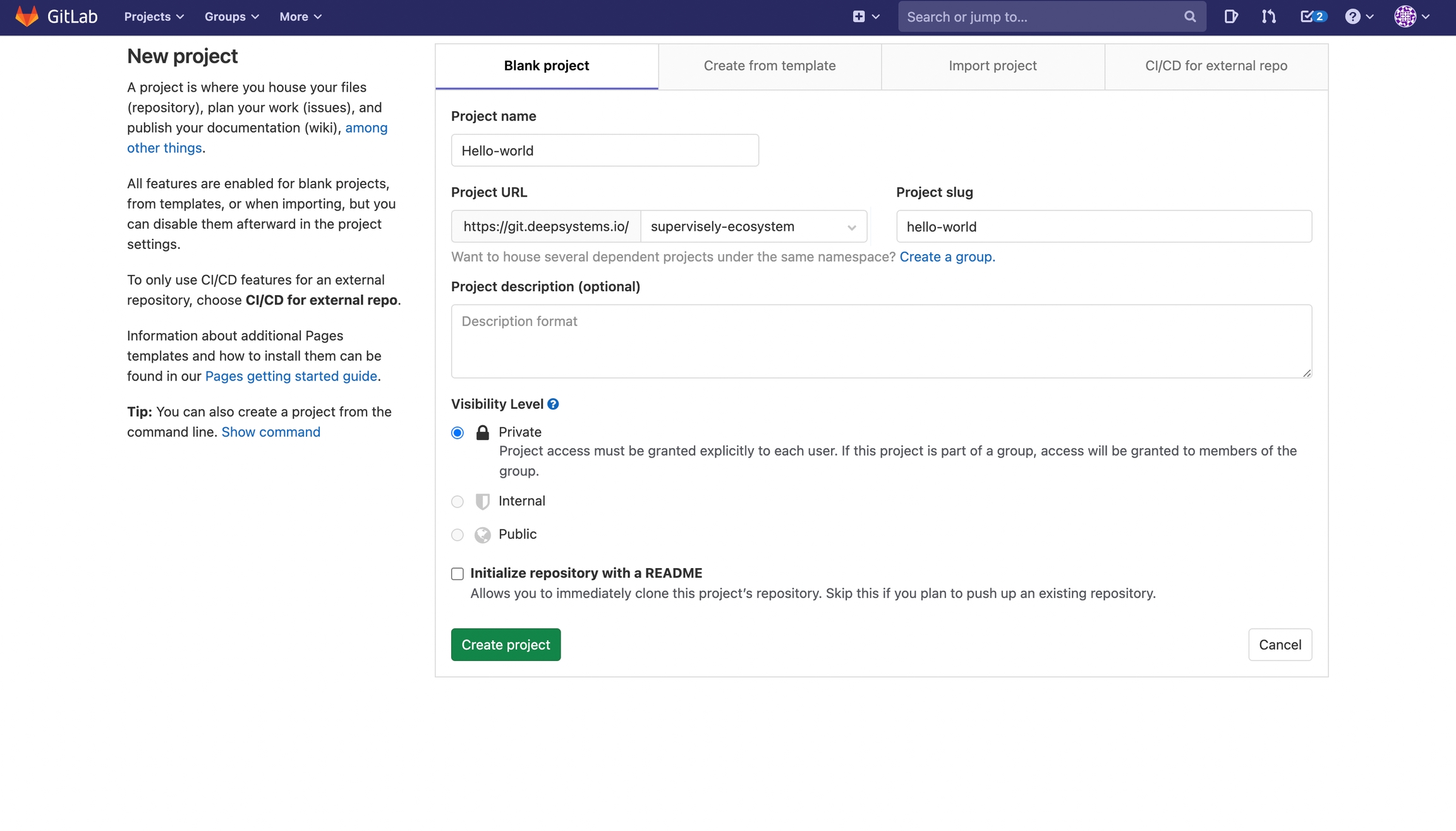 Let's create a new GitLab repository that we will use to deploy a new Supervisely application. Create a new project.