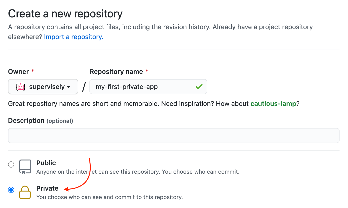 Let's create a new GitHub repository that we will use to deploy a new Supervisely application. Create a new private GitHub repository: do not forget to choose "Private" visibility option.