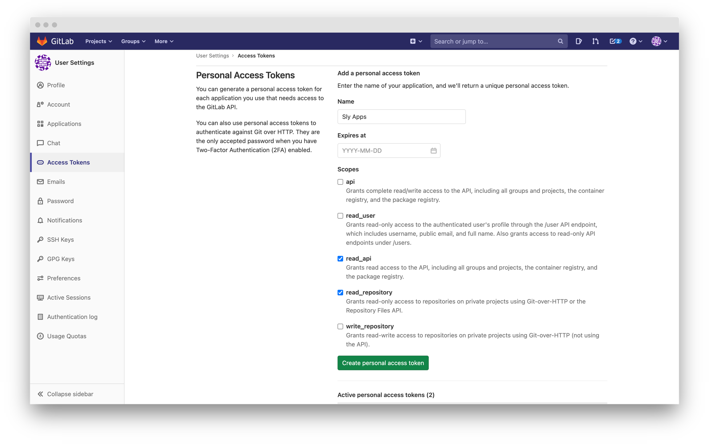 Open GilLab → Settings → Access Tokens