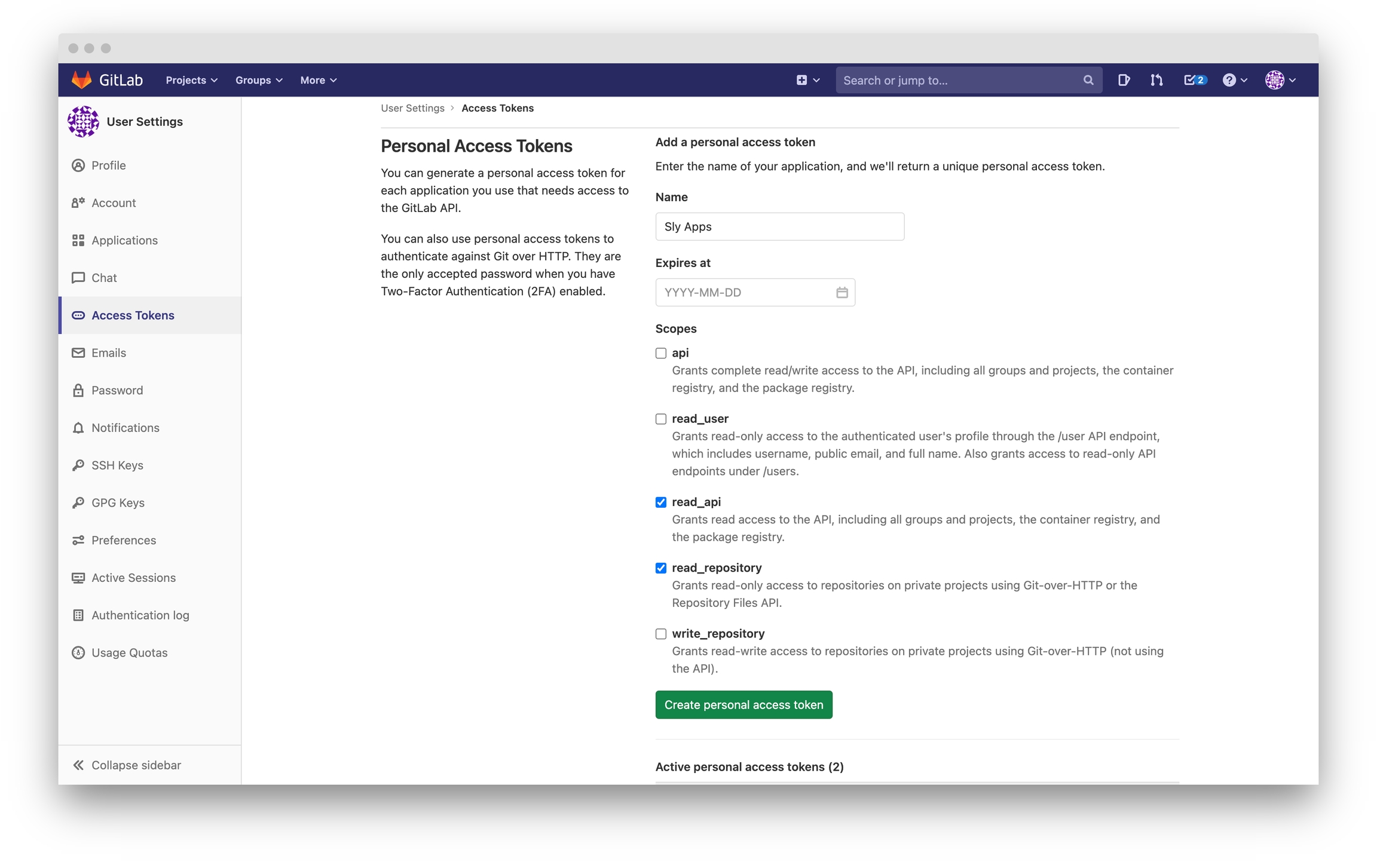 Select with "read_api", "read_repository" scopes enabled and click "Create personal access token" button. Save generated token — you will need it later.