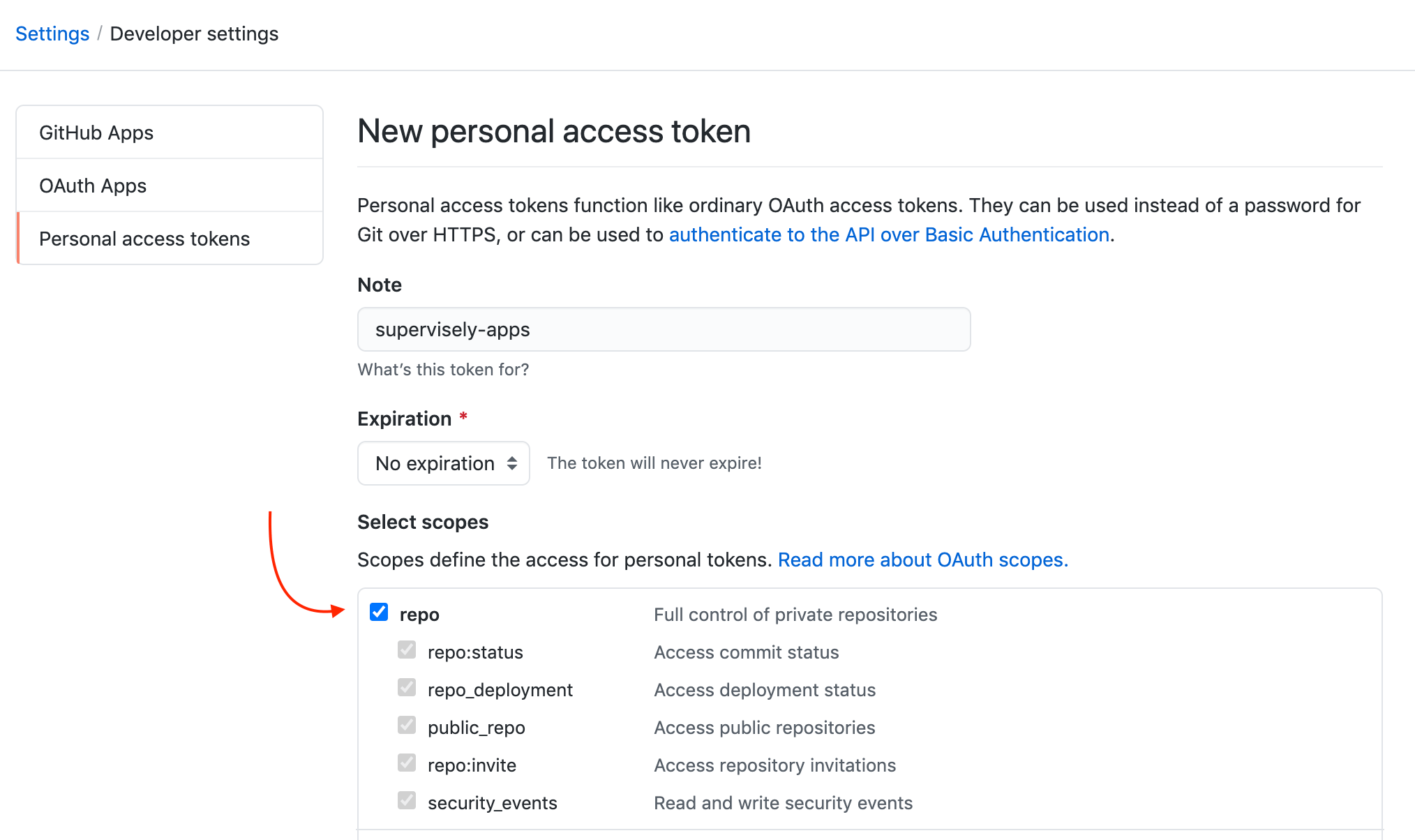 Select "repo" access scope and click "Generate token" button. Save generated token — you will need it later.