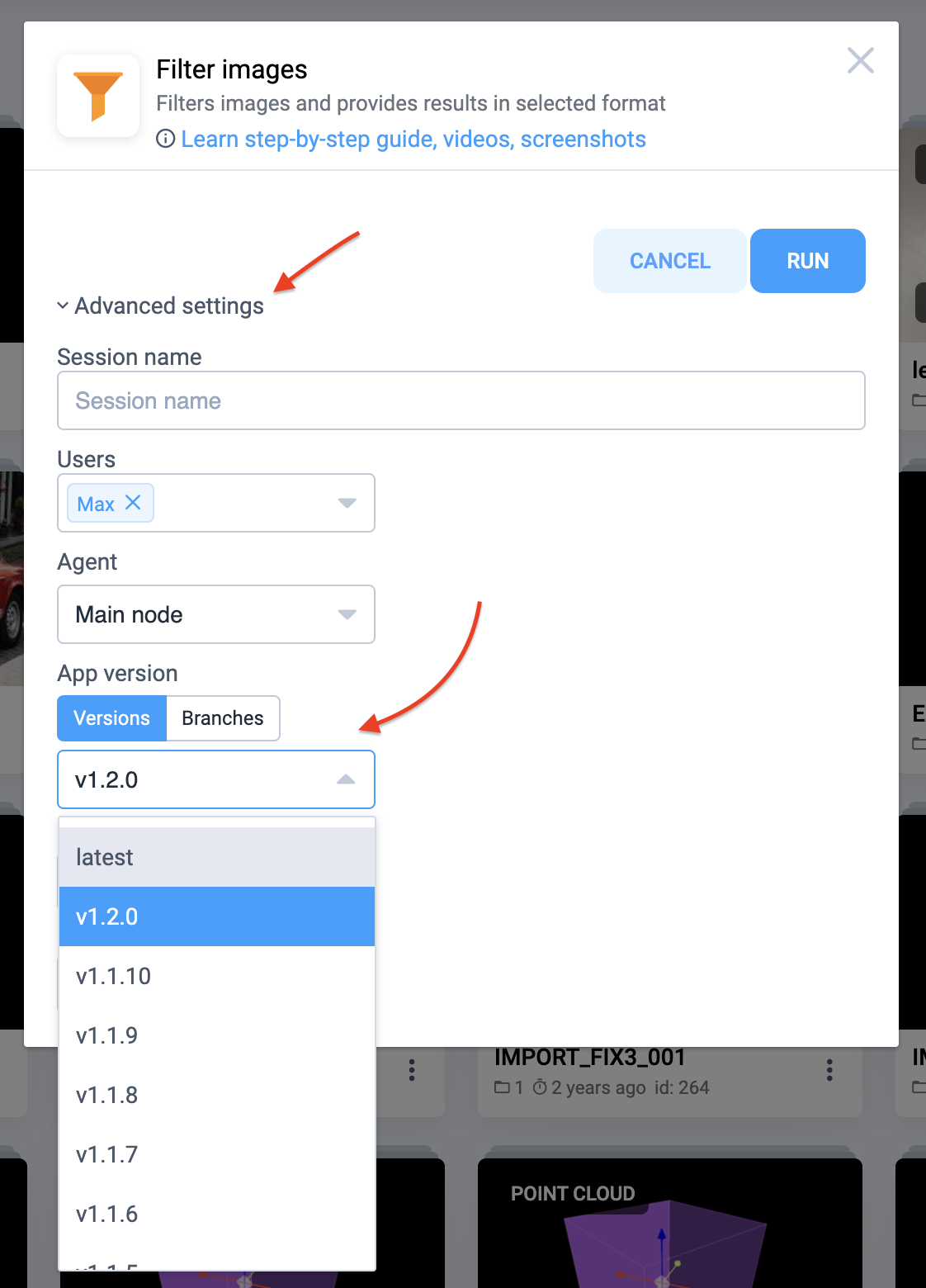 Thus you can quickly do releases of your app. All releases will be available on the application page. Just select the release in the modal window in the advanced section before running the app. The latest release is selected by default.