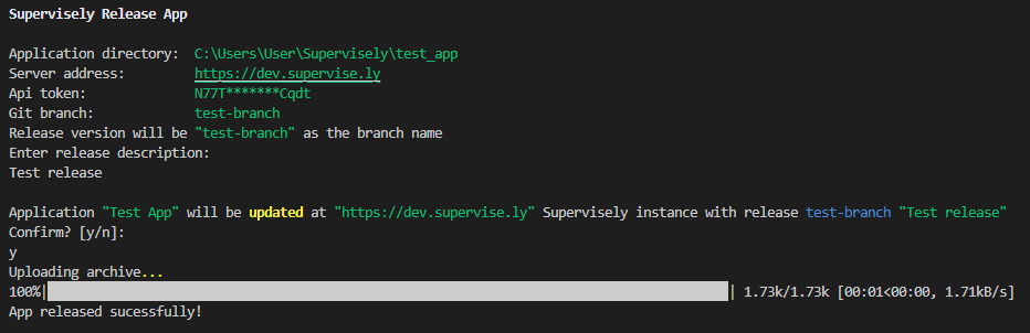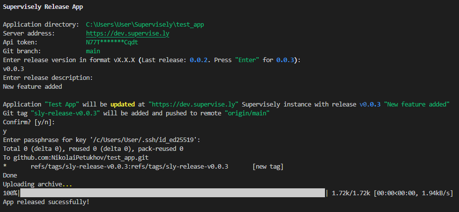 You will be asked for a release description and in case of releasing from main/master branch for release version. After that, you will see a summary message and confirmation request. If releasing from main/master branch new tag will be created and pushed to remote (You may be asked for git authentication). Then if there are no errors you will see the "App release successfully!" message.