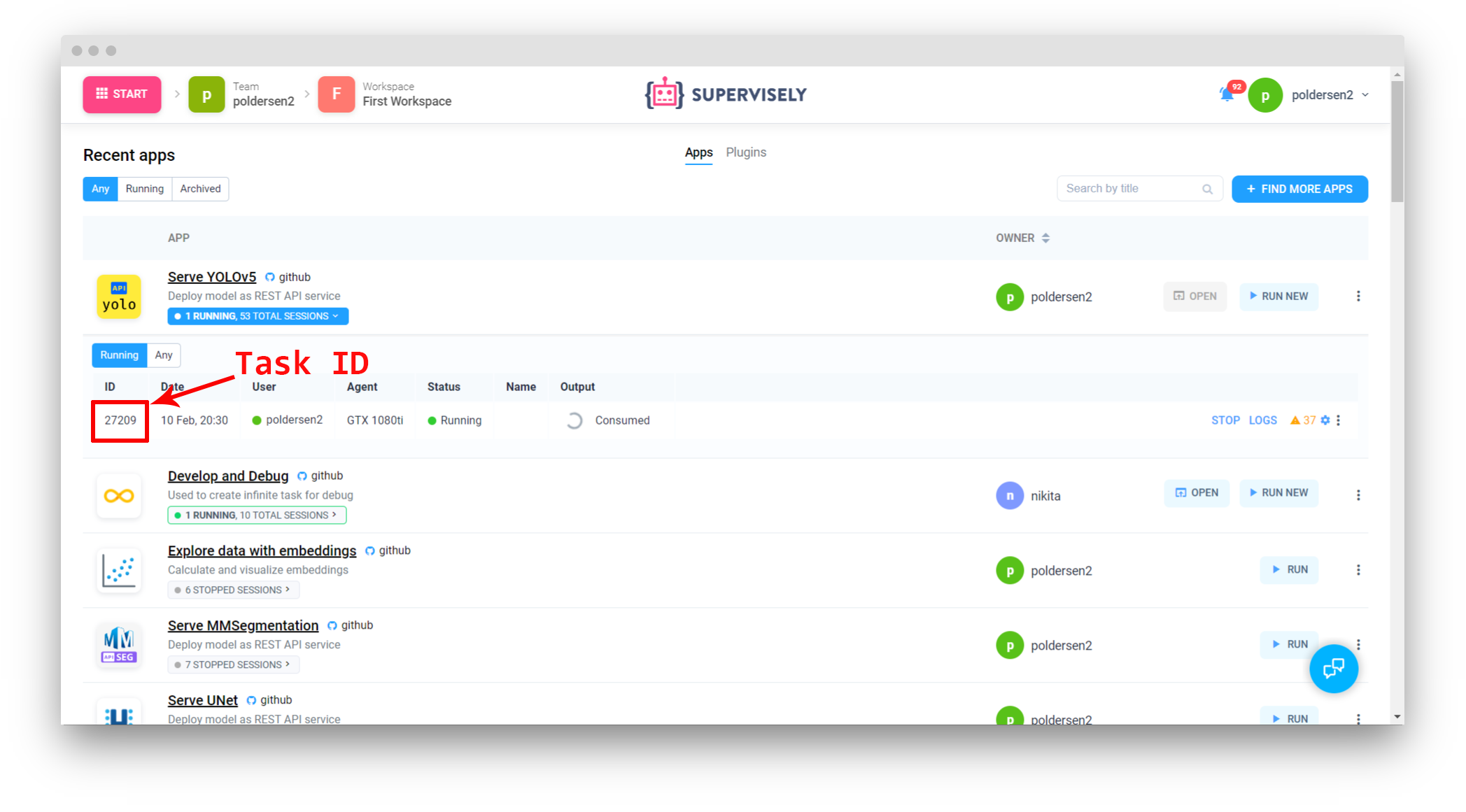 sly.nn.inference.SessionFirst serve the model you want (e.g. Serve YOLOv5) and copy the task_id from the App sessions section in the Supervisely platform: