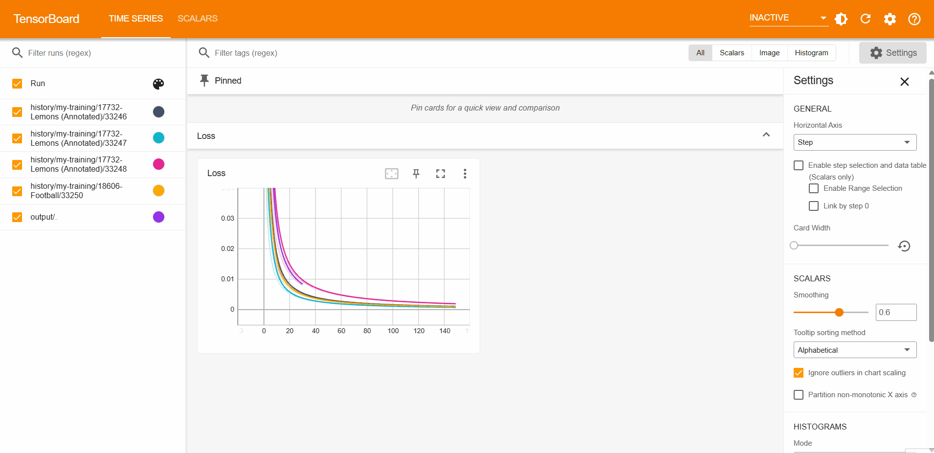 Note, that you can always load your previous logs just by simply specifying HISTORY_DIR in run.sh. Here how it will look like in the tensorboard interface:
