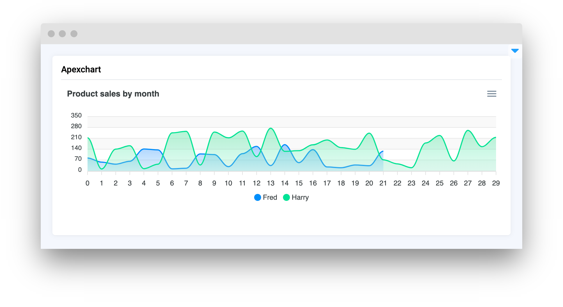 **`Apexchart`** is a widget in Supervisely that allows for displaying interactive charts on the UI. It supports various chart types such as `line`, `area`, and `bar`. Users can customize the chart by changing the chart type, color schemes, and legend location.