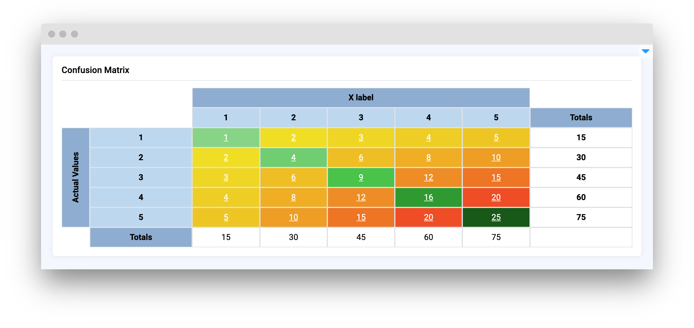 **`ConfusionMatrix`** is a widget that display a given confusion matrix with color-coded visualization for better interpretation. It also shows row and column totals.