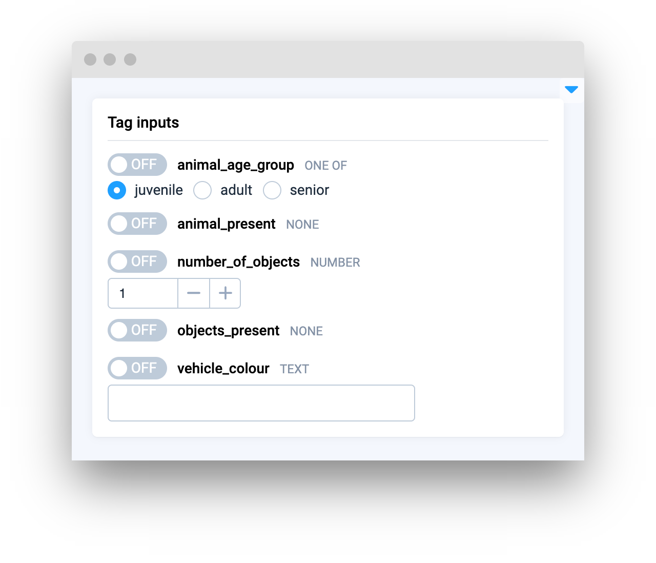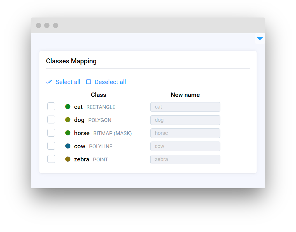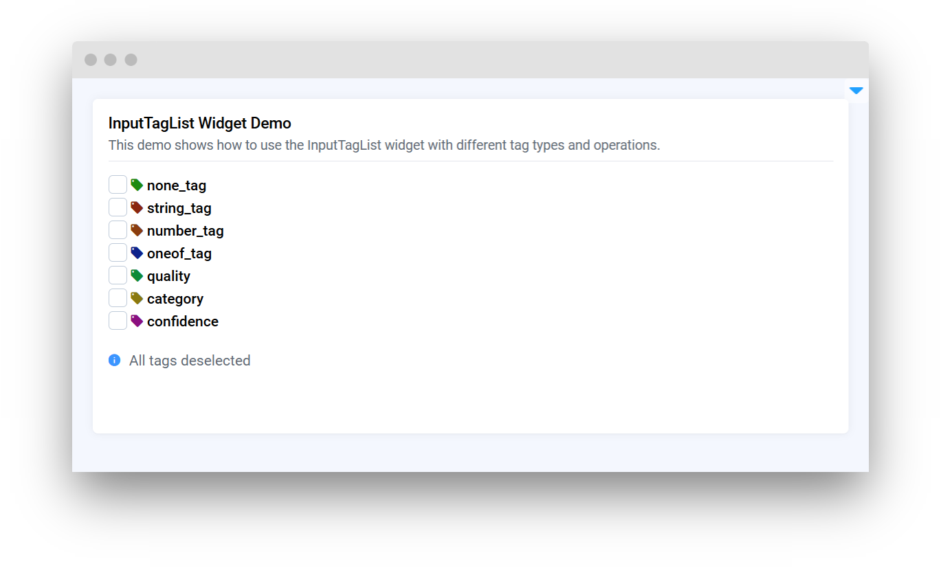 <table data-card-size="large" data-view="cards"><thead><tr><th></th><th></th><th></th><th data-hidden data-card-target data-type="content-ref"></th></tr></thead><tbody><tr><td><strong>Input</strong></td><td><img src="https://1972929262-files.gitbook.io/~/files/v0/b/gitbook-x-prod.appspot.com/o/spaces%2F2ZRtnNbqSpWk5uCfyE1A%2Fuploads%2Fgit-blob-8825cb976e06722838ecdc3ef090e9ceaa96737a%2Fimage%20(20).png?alt=media" alt="" data-size="original"></td><td><mark style="color:purple;">Enables users to enter custom text for data processing or interaction</mark></td><td><a href="input/input">input</a></td></tr><tr><td><strong>InputNumber</strong></td><td><img src="https://1972929262-files.gitbook.io/~/files/v0/b/gitbook-x-prod.appspot.com/o/spaces%2F2ZRtnNbqSpWk5uCfyE1A%2Fuploads%2Fgit-blob-4f3a600af73c75a40fbc91900830a2583f7a5552%2Fwidgets-inputNumber.png?alt=media" alt=""></td><td><mark style="color:purple;">Allows users to input or select a numerical value within a defined range</mark></td><td><a href="input/inputnumber">inputnumber</a></td></tr><tr><td><strong>InputTag</strong></td><td><img src="https://1972929262-files.gitbook.io/~/files/v0/b/gitbook-x-prod.appspot.com/o/spaces%2F2ZRtnNbqSpWk5uCfyE1A%2Fuploads%2Fgit-blob-9059199a0132c30f7927d2021b64662cd2977f78%2Fwidget-tagInput.png?alt=media" alt=""></td><td><mark style="color:purple;">Select or enter multiple items and categorize them with tags for easy organization and retrieval</mark></td><td><a href="input/inputtag">inputtag</a></td></tr><tr><td><strong>InputTagList</strong></td><td><img src="https://1972929262-files.gitbook.io/~/files/v0/b/gitbook-x-prod.appspot.com/o/spaces%2F2ZRtnNbqSpWk5uCfyE1A%2Fuploads%2Fgit-blob-90cbc36d1187415d6ec9b6130226d083b009e04a%2Fwidget-tagInputList.png?alt=media" alt=""></td><td><mark style="color:purple;">Select multiple tags.</mark></td><td><a href="input/inputtaglist">inputtaglist</a></td></tr><tr><td><strong>BindedInputNumber</strong></td><td><img src="https://1972929262-files.gitbook.io/~/files/v0/b/gitbook-x-prod.appspot.com/o/spaces%2F2ZRtnNbqSpWk5uCfyE1A%2Fuploads%2Fgit-blob-b4915311caa6b5bd95a680e72578640b22e23fd0%2Fimage.png?alt=media" alt=""></td><td><mark style="color:purple;">Dual fields for inputting and correlating two different numerical values, ideal for defining a range or related parameters</mark></td><td><a href="input/bindedinputnumber">bindedinputnumber</a></td></tr><tr><td><strong>DatePicker</strong></td><td><img src="https://user-images.githubusercontent.com/79905215/226652706-16c62fd6-4230-440b-acbb-5256f10af3cf.png" alt=""></td><td><mark style="color:purple;">An interactive calendar allows users to select a specific date</mark></td><td><a href="input/datepicker">datepicker</a></td></tr><tr><td><strong>DateTimePicker</strong></td><td><img src="https://1972929262-files.gitbook.io/~/files/v0/b/gitbook-x-prod.appspot.com/o/spaces%2F2ZRtnNbqSpWk5uCfyE1A%2Fuploads%2Fgit-blob-723b27d78b082cfb44df9f3b844a9ef49a0ee752%2F264597308-fec26f04-67d7-469d-b7d8-a0d783d3d873.png?alt=media" alt=""></td><td><mark style="color:purple;">Combines a calendar and clock interface for selecting both date and precise time</mark><br></td><td><a href="input/datetimepicker">datetimepicker</a></td></tr><tr><td><strong>ColorPicker</strong></td><td><img src="https://1972929262-files.gitbook.io/~/files/v0/b/gitbook-x-prod.appspot.com/o/spaces%2F2ZRtnNbqSpWk5uCfyE1A%2Fuploads%2Fgit-blob-51c11227521811b2bb0e856381728be07e34efe3%2Fcolor-picker.png?alt=media" alt="" data-size="original"></td><td><mark style="color:purple;">Color selector supporting multiple color formats</mark></td><td><a href="input/colorpicker">colorpicker</a></td></tr><tr><td><strong>TimePicker</strong></td><td><img src="https://1972929262-files.gitbook.io/~/files/v0/b/gitbook-x-prod.appspot.com/o/spaces%2F2ZRtnNbqSpWk5uCfyE1A%2Fuploads%2Fgit-blob-820d800681242e4e1dbd4849c88c7fb79ab49585%2Ftimepicker-default.png?alt=media" alt="" data-size="original"></td><td><mark style="color:purple;">Interactive time selector</mark></td><td><a href="input/timepicker">timepicker</a></td></tr><tr><td><strong>ClassesMapping</strong></td><td><img src="https://1972929262-files.gitbook.io/~/files/v0/b/gitbook-x-prod.appspot.com/o/spaces%2F2ZRtnNbqSpWk5uCfyE1A%2Fuploads%2Fgit-blob-edfea819f8c8b5d6c518fd4fd8ba0d10ded140dd%2Fimage.png?alt=media" alt="" data-size="original"></td><td><mark style="color:purple;">Rename classes</mark></td><td><a href="input/classesmapping">classesmapping</a></td></tr><tr><td><strong>ClassesColorMapping</strong></td><td><img src="https://1972929262-files.gitbook.io/~/files/v0/b/gitbook-x-prod.appspot.com/o/spaces%2F2ZRtnNbqSpWk5uCfyE1A%2Fuploads%2Fgit-blob-bb978e107471d9f8c17cd347346d8ec3fcb77f85%2Fimage.png?alt=media" alt="" data-size="original"></td><td><mark style="color:purple;">Change classes colors</mark></td><td><a href="input/classescolormapping">classescolormapping</a></td></tr><tr><td><strong>DeployModel</strong></td><td><img src="https://1972929262-files.gitbook.io/~/files/v0/b/gitbook-x-prod.appspot.com/o/spaces%2F2ZRtnNbqSpWk5uCfyE1A%2Fuploads%2Fgit-blob-626439ac877cfc6f76a2b5ac160179fe59e7eb70%2Fdeploymodel.png?alt=media" alt="" data-size="original"></td><td><mark style="color:purple;">Allows to deploy or connect to neural network models</mark></td><td><a href="input/deploymodel">deploymodel</a></td></tr></tbody></table>