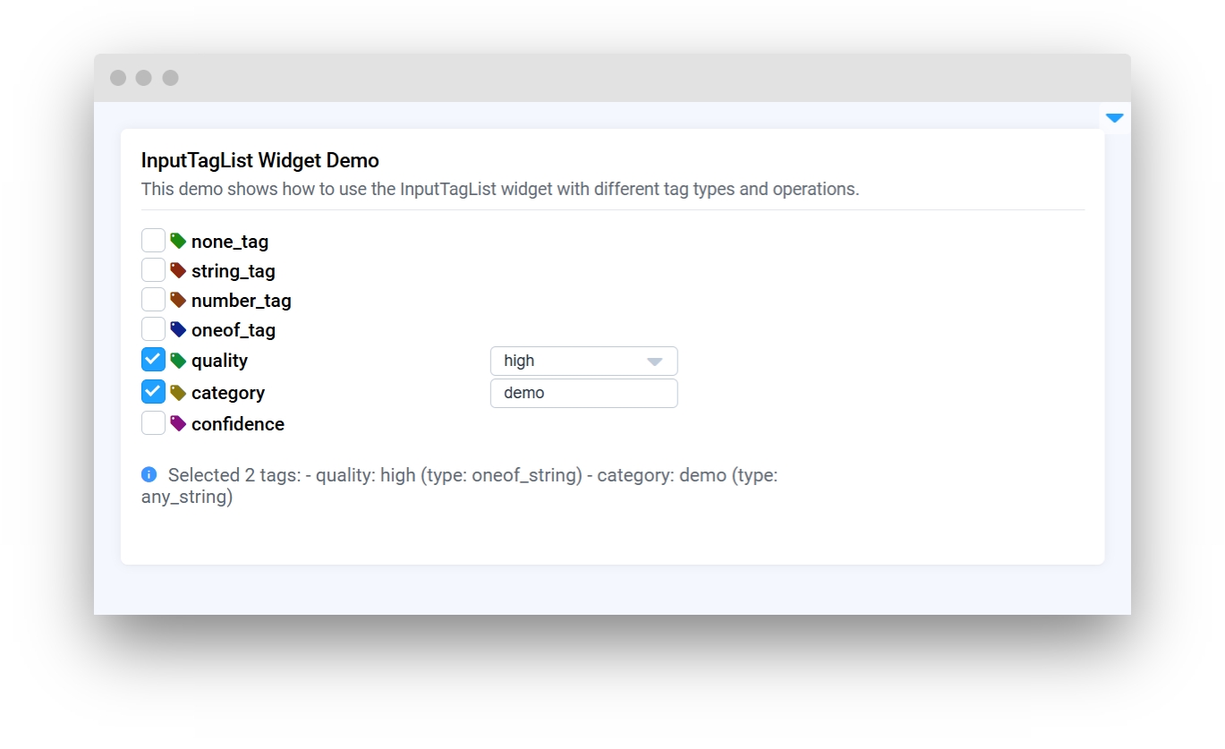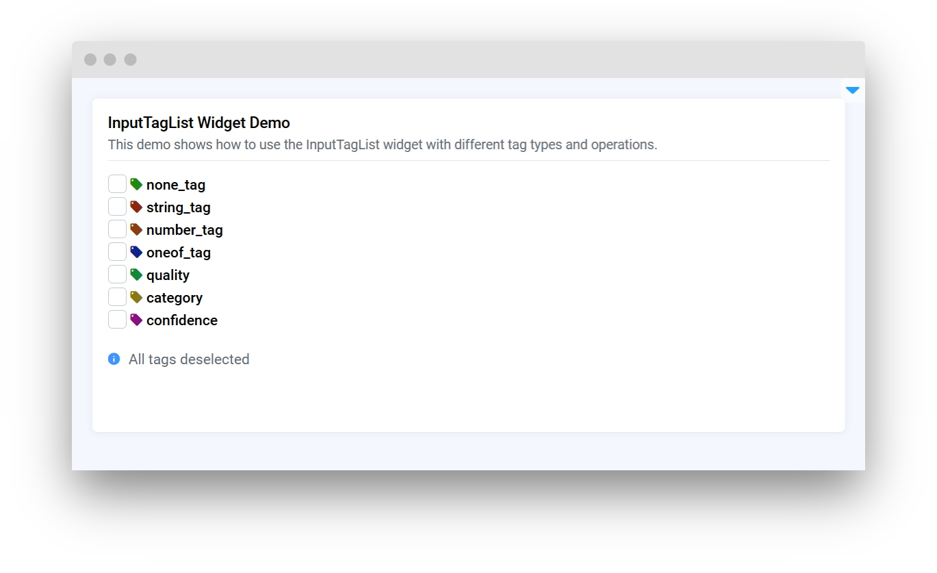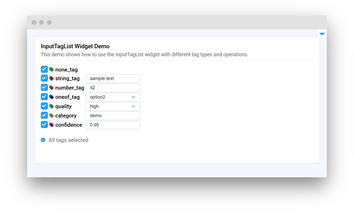 InputTagList widget in Supervisely is a user interface element that allows users to work with multiple tag labels simultaneously. Unlike the single InputTag widget, InputTagList enables bulk operations on tag collections, making it easier to manage multiple tags at once. It uses a list of TagMeta objects and provides convenient methods for selecting, deselecting, and manipulating multiple tags. This widget is particularly useful for applications that need to handle multiple tag operations efficiently.