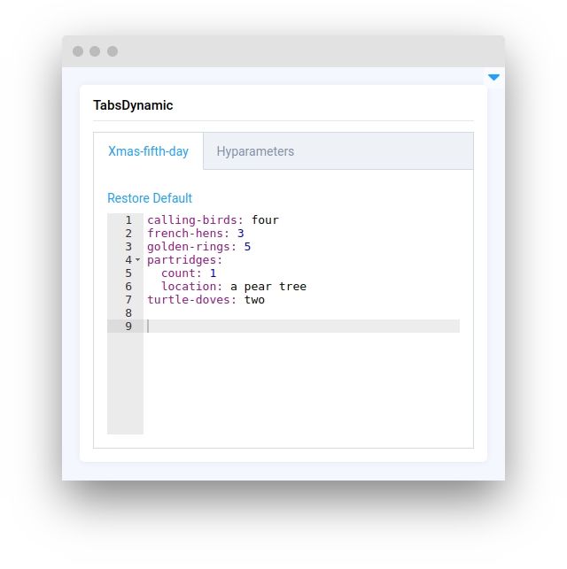 is a versatile widget in Supervisely that allows users to display and edit YAML files within their info, such as NN model settings. The widget can divide the YAML file into separate tabs, making it easier to navigate and manage complex data structures. Additionally, users can edit the YAML directly within the widget and obtain a merged YAML file with their changes. TabsDynamic