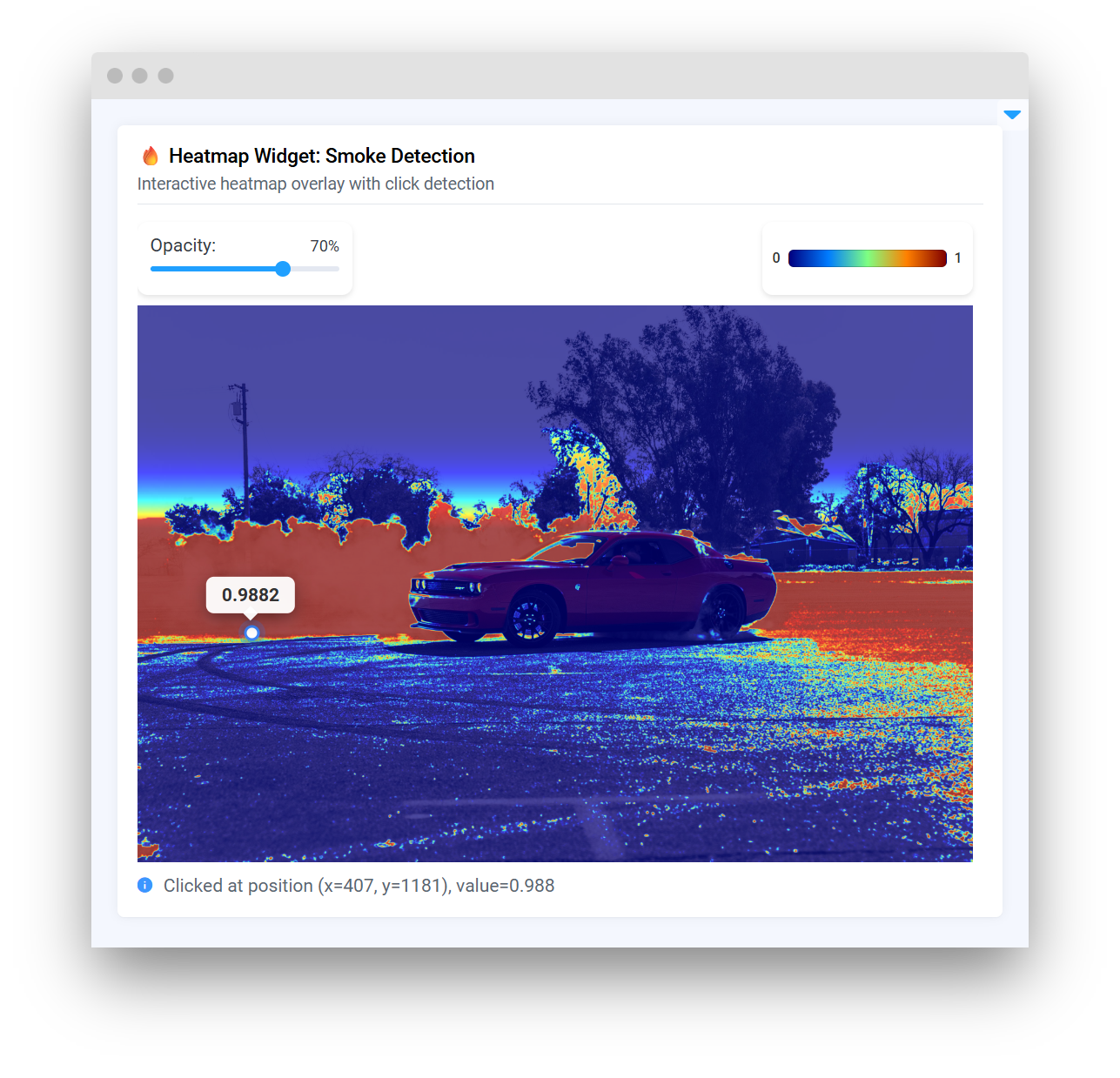 The Heatmap widget provides built-in interactivity, allowing users to click on the heatmap to retrieve exact values at specific coordinates. It supports customizable colormaps, opacity control, zoom and pan controls, configurable blur for visualization smoothing, and can work with both image files and NumPy arrays.