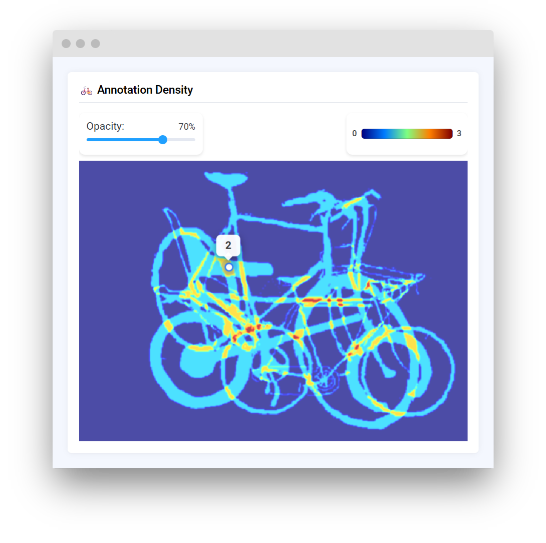 Heatmap widget in Supervisely allows for displaying interactive heatmap overlays on top of background images. This widget is particularly useful for visualizing density maps, attention mechanisms, prediction confidence, or any other spatial data that can be represented as a 2D array of values.