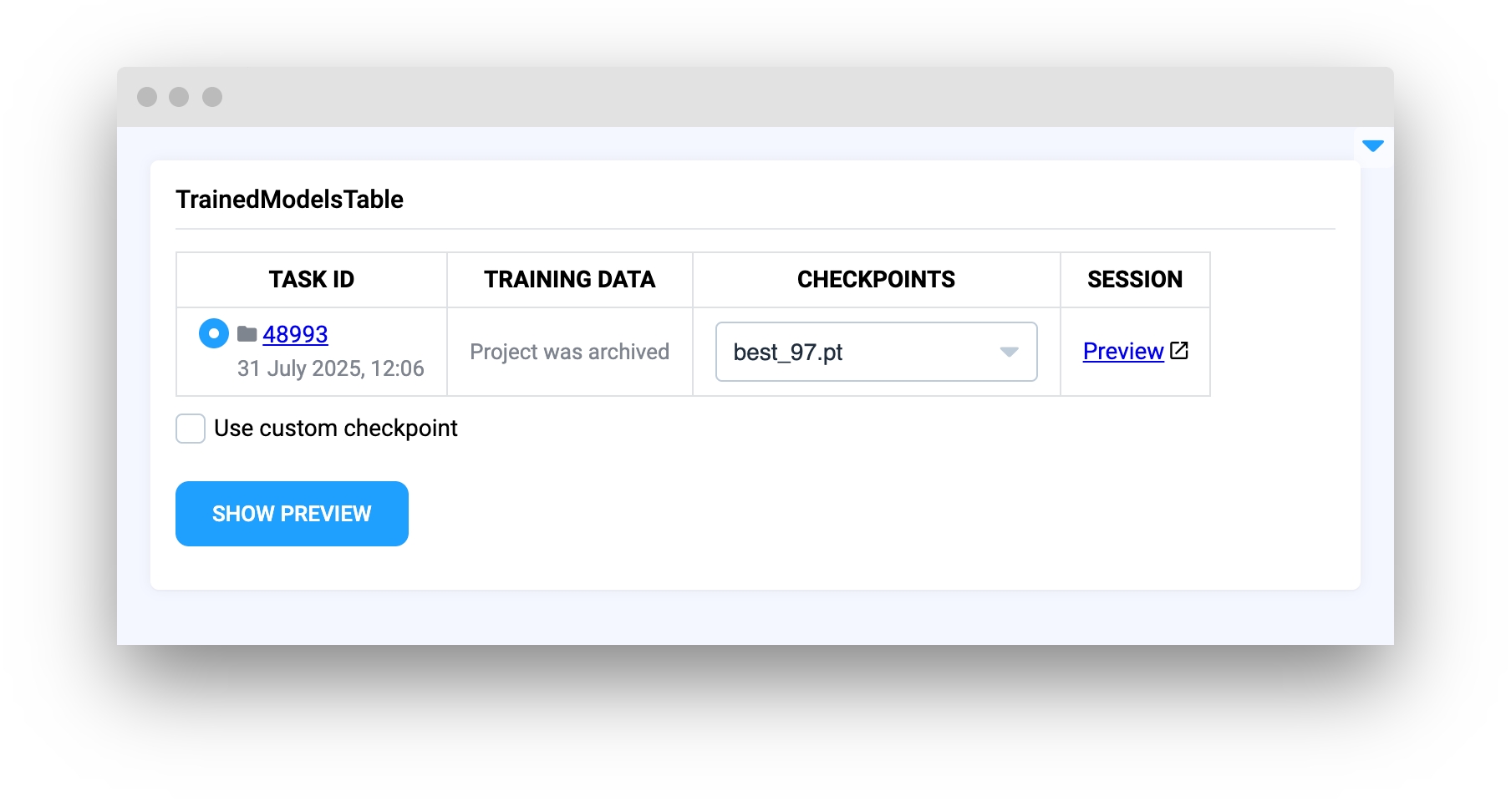 CustomModelsSelector widget allows creating a table with NN models that you have trained in Supervisely by providing path to training application default save directory, Team ID and task type (e.g. object detection, instance segmentation, pose estimation and etc).