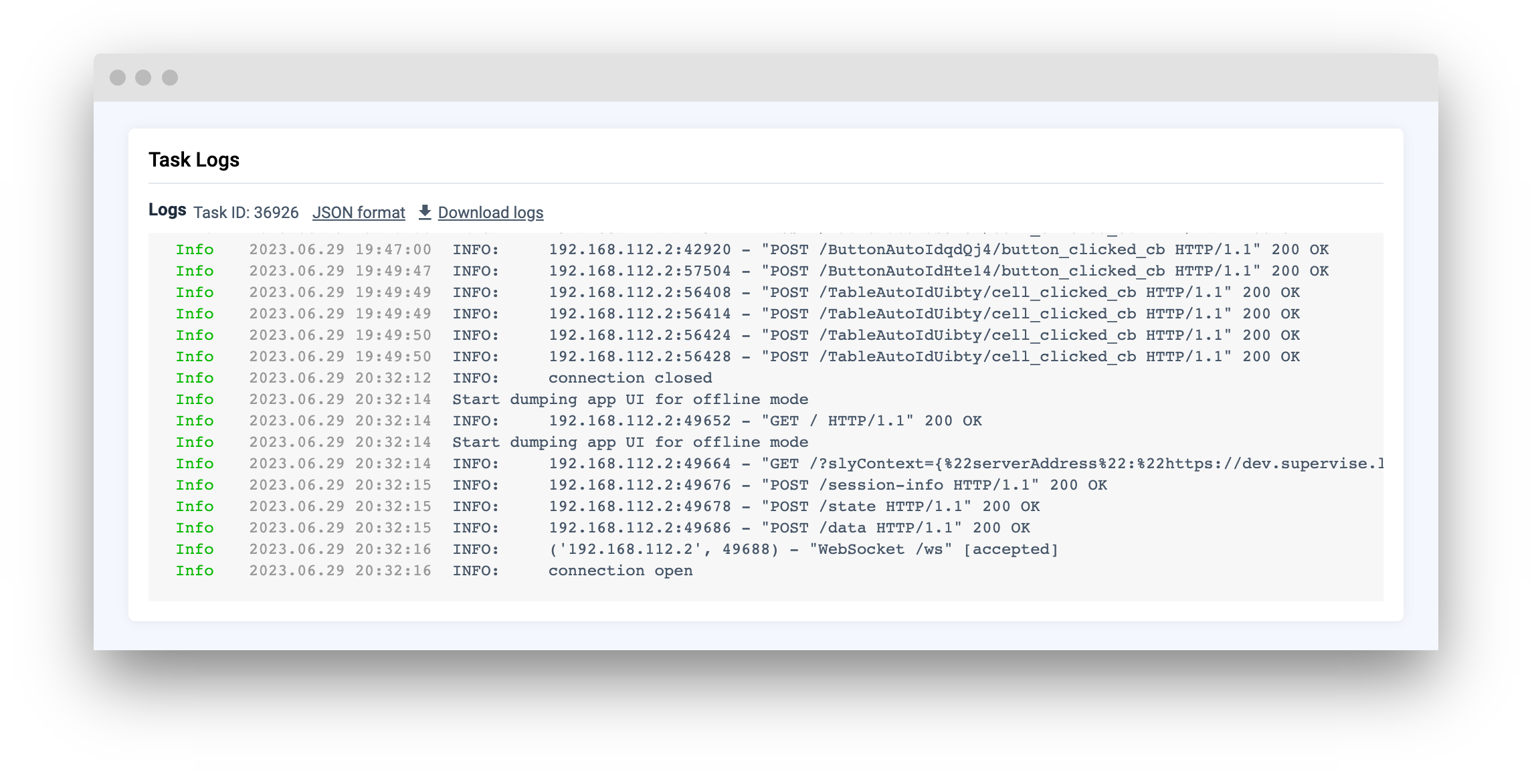 The\*\*`TaskLogs`\*\* widget in Supervisely is designed to display task logs for a given task ID.