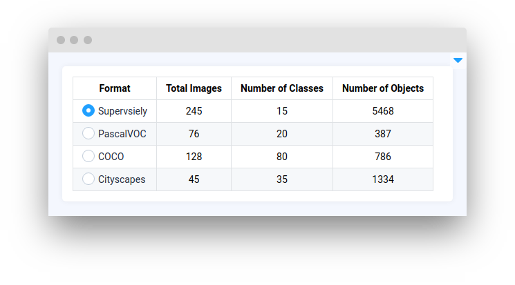 <table data-card-size="large" data-view="cards"><thead><tr><th></th><th></th><th></th><th data-hidden data-card-target data-type="content-ref"></th></tr></thead><tbody><tr><td><strong>Table</strong></td><td><img src="https://1972929262-files.gitbook.io/~/files/v0/b/gitbook-x-prod.appspot.com/o/spaces%2F2ZRtnNbqSpWk5uCfyE1A%2Fuploads%2Fgit-blob-ff5d44f7eb587c9c85ec9c93db77044f456a7b16%2Fwidget-table.png?alt=media" alt=""></td><td><mark style="color:purple;">Standard widget for displaying data in a tabular format, allowing for an organized view of rows and columns</mark></td><td><a href="tables/table">table</a></td></tr><tr><td><strong>Classic Table</strong></td><td><img src="https://1972929262-files.gitbook.io/~/files/v0/b/gitbook-x-prod.appspot.com/o/spaces%2F2ZRtnNbqSpWk5uCfyE1A%2Fuploads%2Fgit-blob-1f2a8865f39c37a82594212ee61cb126c812bc24%2Fwidget-classictable.png?alt=media" alt=""></td><td><mark style="color:purple;">[Legacy] Outdated version of <strong>Table</strong> widget with fewer options</mark></td><td><a href="tables/classictable">classictable</a></td></tr><tr><td><strong>Radio Table</strong></td><td><img src="https://1972929262-files.gitbook.io/~/files/v0/b/gitbook-x-prod.appspot.com/o/spaces%2F2ZRtnNbqSpWk5uCfyE1A%2Fuploads%2Fgit-blob-22c1695faf941255472cf3a7a9dcae336f87e773%2Fwidget-radioTable.png?alt=media" alt=""></td><td><mark style="color:purple;">Selection of a single row within the table to perform specific actions or operations, using radio buttons for selection</mark></td><td><a href="tables/radiotable">radiotable</a></td></tr><tr><td><strong>Classes Table</strong></td><td><img src="https://1972929262-files.gitbook.io/~/files/v0/b/gitbook-x-prod.appspot.com/o/spaces%2F2ZRtnNbqSpWk5uCfyE1A%2Fuploads%2Fgit-blob-816c683d2d3dbc518ed8eb6dfe57ff10d780ff8d%2Fwidget-classsesTable.png?alt=media" alt=""></td><td><mark style="color:purple;">Specialized for displaying object classes with their associated properties, includes a selector</mark></td><td><a href="tables/classestable">classestable</a></td></tr><tr><td><strong>Random Splits Table</strong></td><td><img src="https://1972929262-files.gitbook.io/~/files/v0/b/gitbook-x-prod.appspot.com/o/spaces%2F2ZRtnNbqSpWk5uCfyE1A%2Fuploads%2Fgit-blob-c130cc07bc0641d83010f06f00a38da322d8b128%2Fwidget-randomSplitsTable.png?alt=media" alt=""></td><td><mark style="color:purple;">Tool for splitting data into training and validation sets, which is common in machine learning and data analysis to evaluate models and algorithms</mark></td><td><a href="tables/randomsplitstable">randomsplitstable</a></td></tr><tr><td><strong>Fast Table</strong></td><td><img src="https://1972929262-files.gitbook.io/~/files/v0/b/gitbook-x-prod.appspot.com/o/spaces%2F2ZRtnNbqSpWk5uCfyE1A%2Fuploads%2Fgit-blob-26c59d29a1b35537103d23d4f89b0e8178472244%2Fwidget-fastTable.png?alt=media" alt=""></td><td><mark style="color:purple;">Specialized for displaying various statistics on a dataset and processing data on the server side</mark></td><td><a href="tables/fasttable">fasttable</a></td></tr><tr><td><strong>TagsTable</strong></td><td><img src="https://1972929262-files.gitbook.io/~/files/v0/b/gitbook-x-prod.appspot.com/o/spaces%2F2ZRtnNbqSpWk5uCfyE1A%2Fuploads%2Fgit-blob-37eff812c0e67de37beb2c923f2ed3e3a333601e%2Ftagstable.png?alt=media" alt=""></td><td><mark style="color:purple;">Displays all given tags from the project meta</mark></td><td><a href="tables/tagstable">tagstable</a></td></tr><tr><td><strong>ReorderTable</strong></td><td></td><td><mark style="color:purple;">Allows users to reorder rows with drag-and-drop and provides quick actions for moving selected rows</mark></td><td><a href="tables/reordertable">reordertable</a></td></tr></tbody></table>