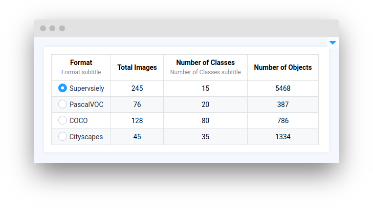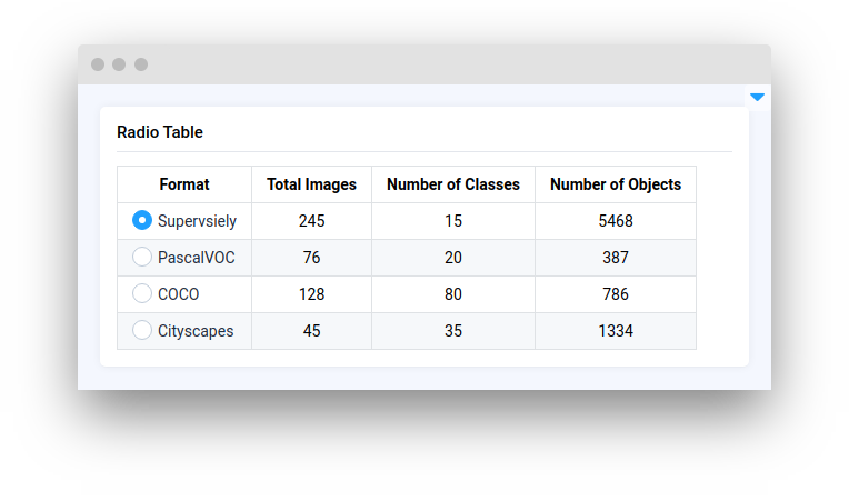 **`RadioTable`** widget in Supervisely is a user interface element that allows creating a table of options, each with a corresponding radio button. With `RadioTable` widget, developer can define multiple rows of options, and only one row option can be selected. The RadioTable widget provides a convenient and intuitive way to navigate and make selections within the table.